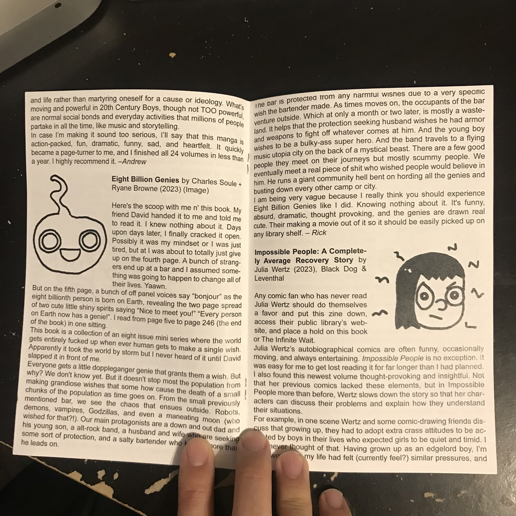 My friend Andrew does a zine called Ritual View where he reviews nonfiction. We have tabled together at fests for a couple of years and we decided to put out an impromptu split zine.